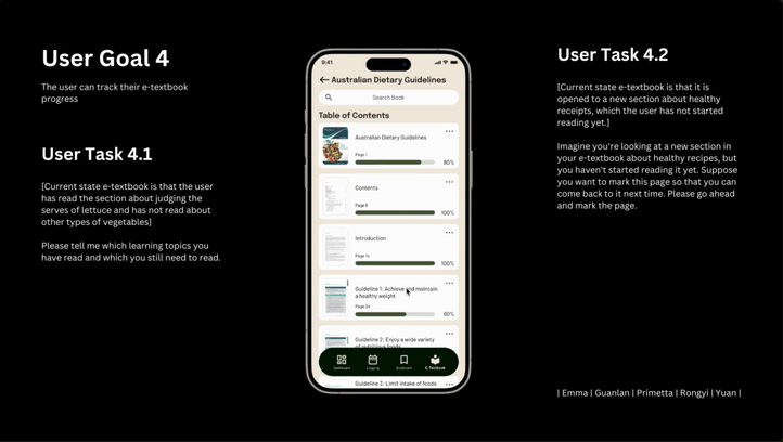 In the course of Usability Engineering in University of Sydney, we are tasked to create a very new form of e-textbook with features not available in conventional e-textbooks. It is for a course that helps students learn about nutrition. This is an important topic since many Australians, especially young adults of the typical age of university students, have poor nutrition knowledge and practices. It could be used for a breadth course at a university or it could be used in a course for students of nutrition or public health.